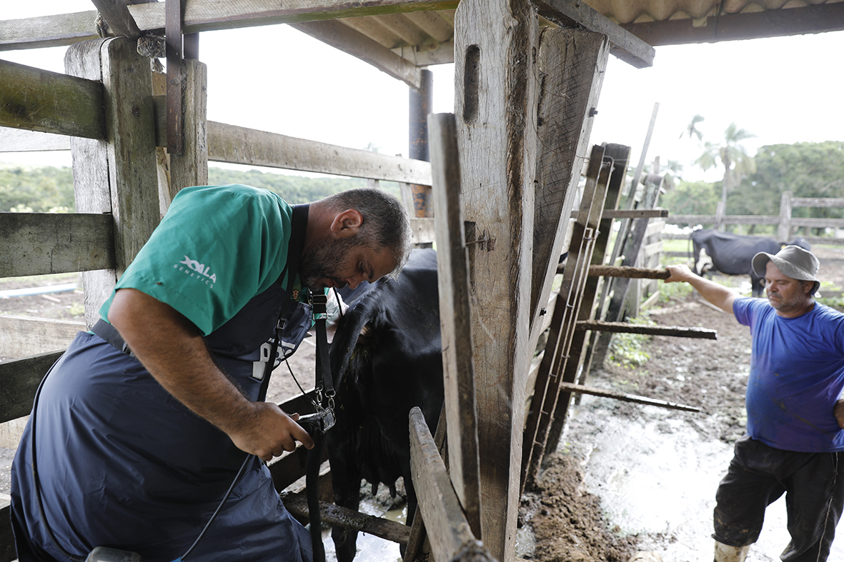 Inicialmente, os profissionais fazem um trabalho para igualar o cio de todas as vacas da propriedade. Na sequência, levam o material genético melhorado ao local e concluem a inseminação. Depois, seguem acompanhando o processo, com direito até a ultrassonografia nos animais.